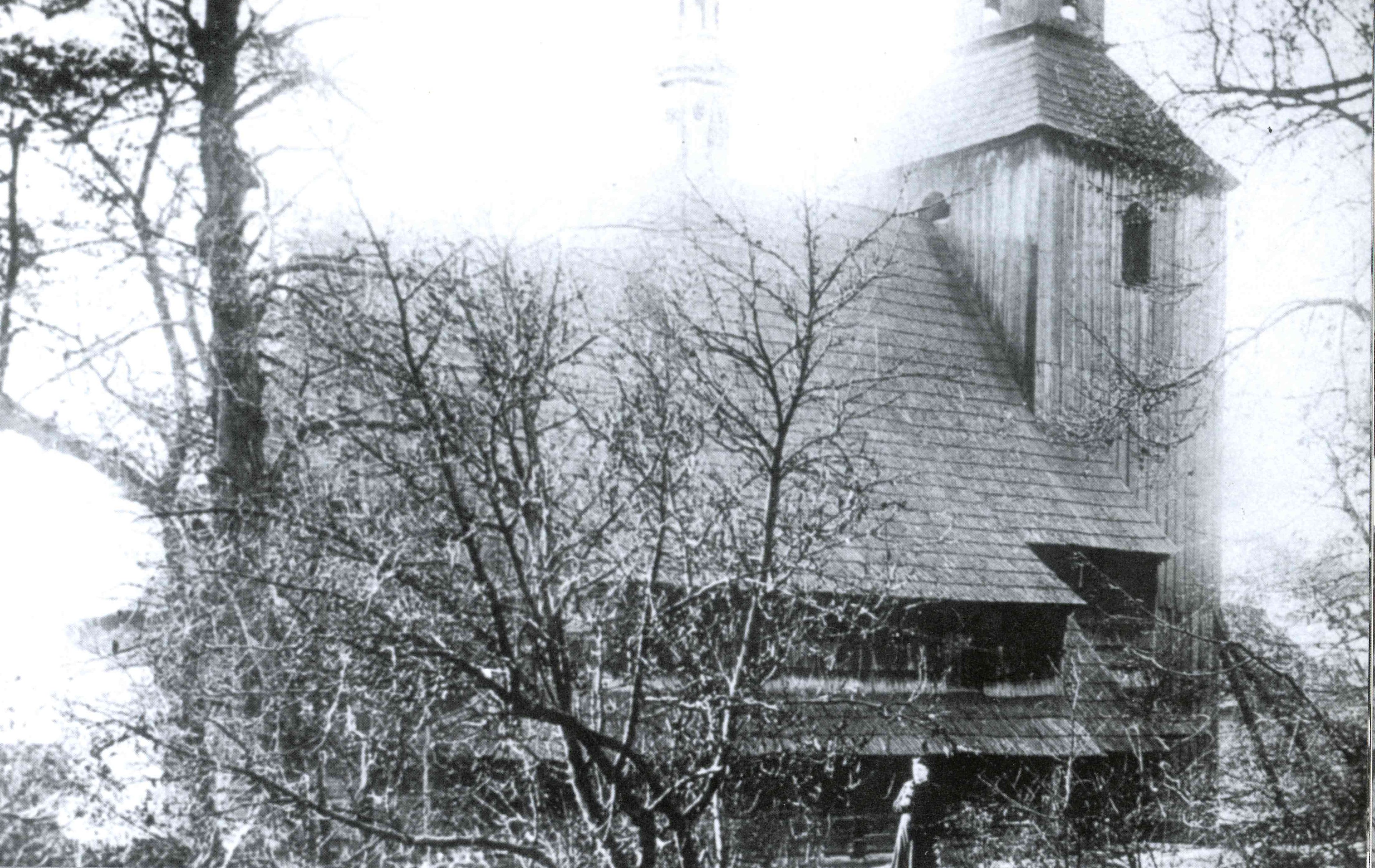 Do początku XX wieku istniał tu drewniany kościół, który mógł być drugim lub trzecim z rzędu. Z 1526r. pochodzi wzmianka o wybudowaniu kolejnego kościoła, który spłonął w 1669 r. Na jego miejsce wniesiono w 1672r. nowy, który przetrwał aż do 1907r.